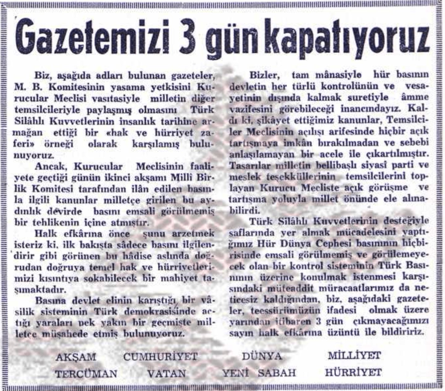 “Millî Birlik Komitesi’nce ilân edilen basınla ilgili kanunlar milletçe girişilen bu aydınlık çağda basını eşi görülmemiş bir tehlikenin içine atmıştır. İlk bakışta sadece basını ilgilendirir gibi görünen bu olay gerçekte doğrudan doğruya temel hak ve özgürlüklerimizi kısıntıya sokabilecek bir mahiyet taşımaktadır.Basının devlet elinin karıştığı bir vasilik sisteminin Türk demokrasisinde açtığı yaraları pek yakın bir geçmişte milletçe müşahede etmiş bulunuyoruz.Türk Silahlı Kuvvetleri’nin desteğiyle saflarında yer almak mücadelesini yaptığımız Hür Dünya Cephesi basınının hiç birinde örneği görülmemiş ve görülemeyecek olan bir kontrol sisteminin Türk basınının üzerine konulmak istenmesi karşısındaki müracaatlarımız da sonuçsuz kaldığından, biz, teessürümüzün belirtisi olmak üzere yarından itibaren üç gün çıkmayacağımızı sayın halkoyuna üzüntü ile bildiririz.”
