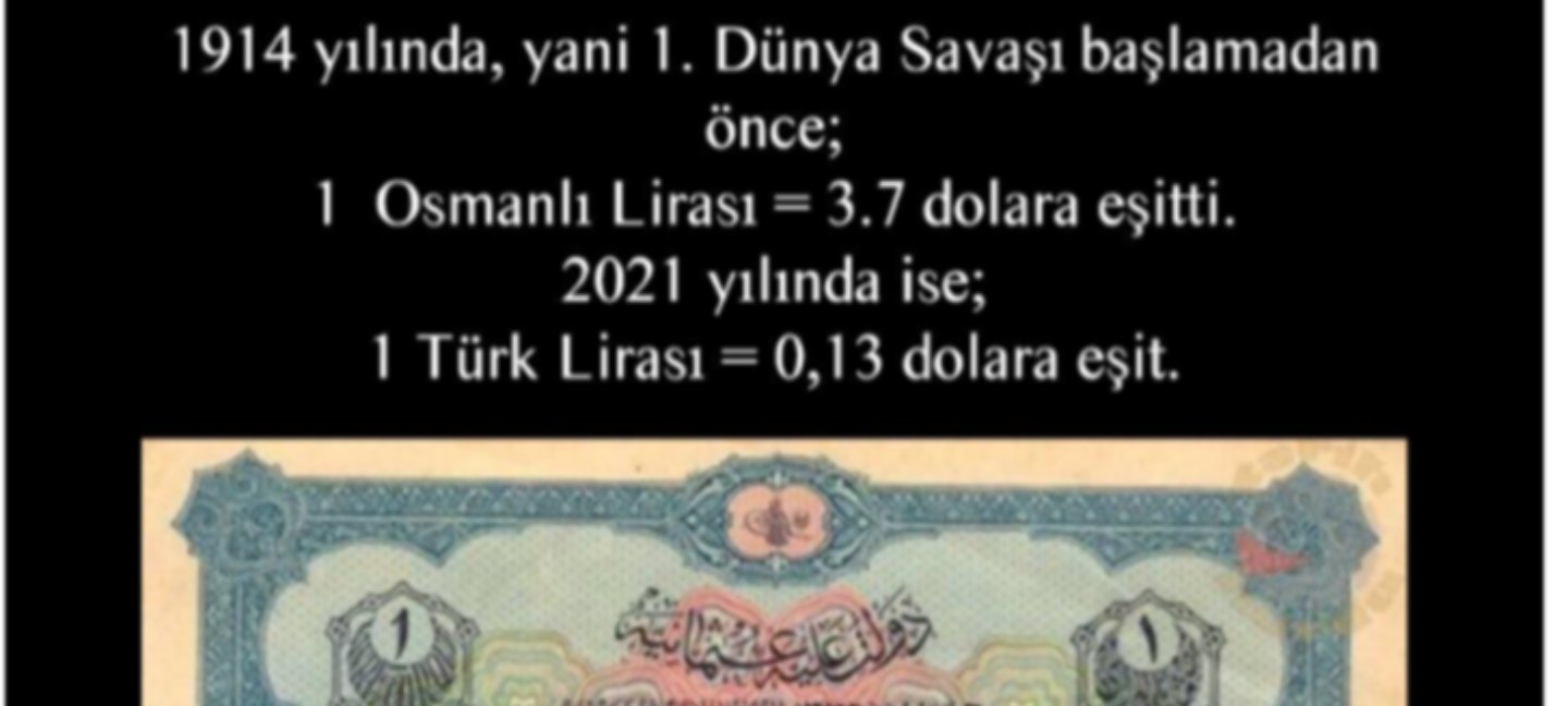 Bir Instagram sayfasında 15 Mart 2021 tarihinde yapılan bir paylaşımda 1914 yılında 1 Osmanlı Lira’sının 3,7 ABD Doları’na eşit olduğu ve 2021 yılında ise 1 Türk Lirası’nın 0,13 ABD Doları’na eşit olduğu iddia edildi. Paylaşım 5 bin civarında beğeni almış.