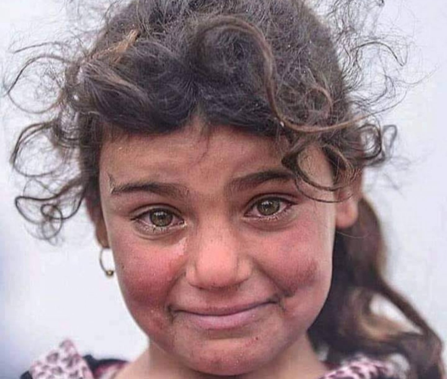 2018 yılından itibaren sosyal medyada paylaşılan bir gönderide, bir Fransız gazetecinin Suriyeli bir kıza gülümse demesi ile bu fotoğrafın ortaya çıktığı belirtiliyor. Bazı gönderilerde kızın Iraklı olduğu ve Irak savaşı sırasında çekildiği belirtilirken, bazı gönderilerde ise kız çocuğunun Suriyeli ya da Filistinli olduğu iddia ediliyor. Benzer hikayeler birçok dilde yayılmış.