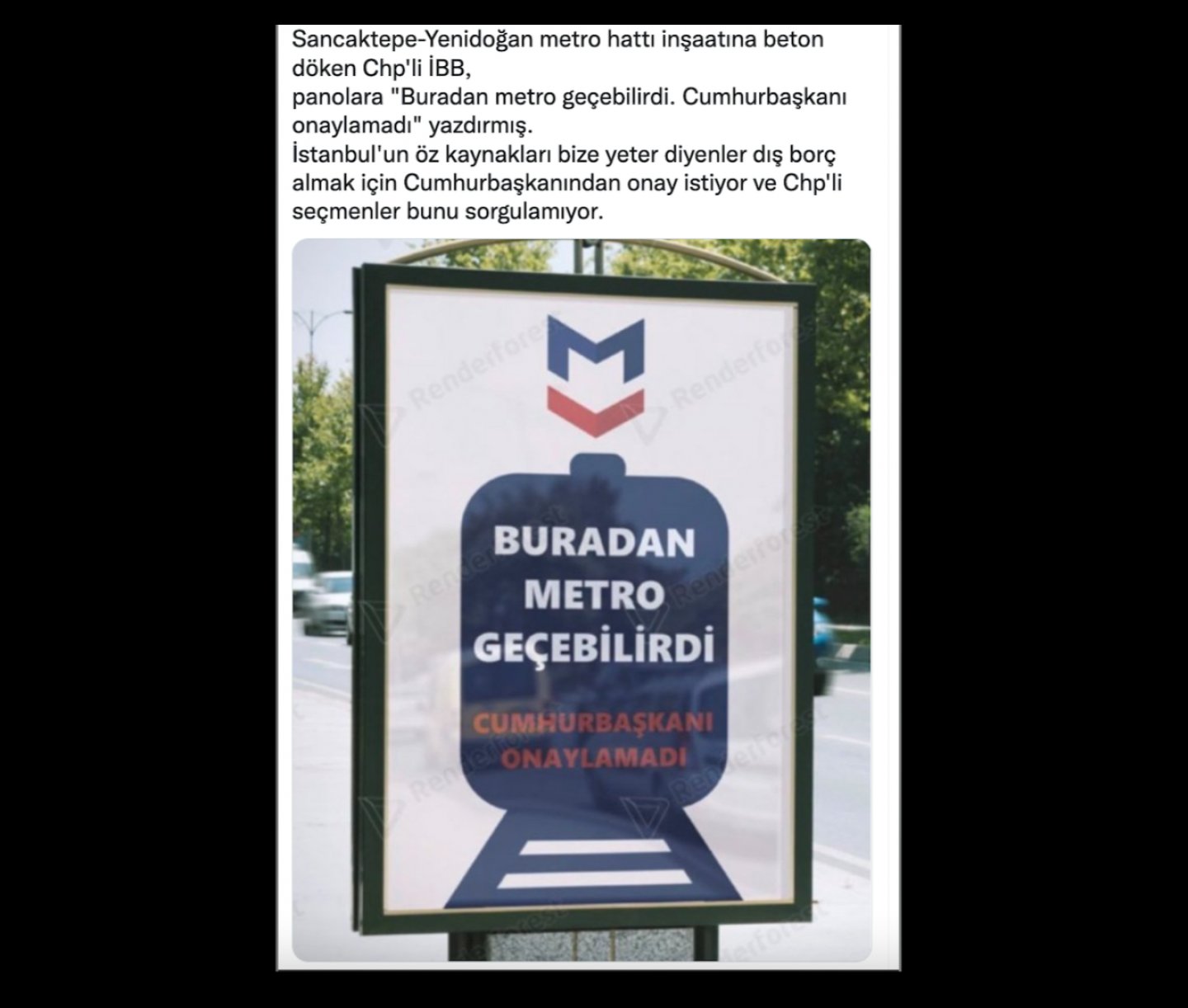 Bir Twitter hesabı tarafından paylaşılan fotoğrafta İBB tarafından “Buradan Metro Geçebilirdi Cumhurbaşkanı Onaylamadı” ifadesini taşıyan bir afiş tasarlandığı iddia edilmişti. Afiş, Renderforest isimli dijital tasarım sitesinde oluşturulmuş. Görsel üzerindeki “renderforest” filigranı da afişin orijinal olmadığını kanıtlıyor. Sitedeki taslaklar incelendiğinde “Otoyol Billboard Paketi” içerisinde paylaşılan görsele ait olduğu ve bu görselin değiştirilebilir olduğu anlaşılıyor. İBB Başkanı Ekrem İmamoğlu kentteki tüm metrobüs duraklarına ve üst geçitlerine, “AKP hükümetinin İBB’nin yapmak istediği işleri engellediğini anlatan” afişler asılacağını söylemiş olsa da henüz böyle bir afişin varlığından söz etmek mümkün değil.
