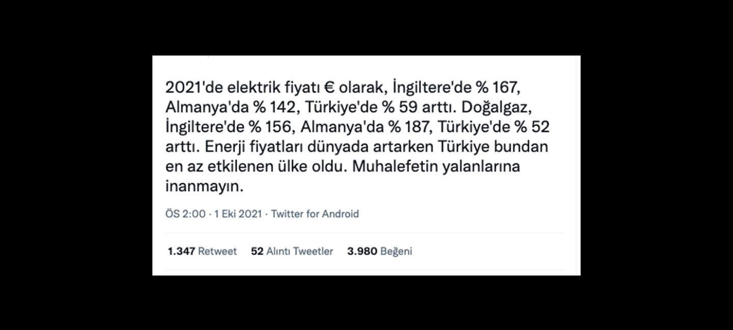 Bir Twitter hesabı tarafından 1 Ekim 2021 tarihinde yapılan paylaşımda; 2021’de euro cinsinden elektrik fiyatlarının İngiltere’de %167, Almanya’da %142, Türkiye’de %59; gaz fiyatlarının ise İngiltere’de %156, Almanya’da %187, Türkiye’de %52 arttığı, enerji fiyatlarında dünyada yaşanan artıştan Türkiye’nin en az etkilenen ülke olduğu iddia edildi. Gönderi üç binin üzerinde beğeni ve bin dört yüzden fazla retweet almış.