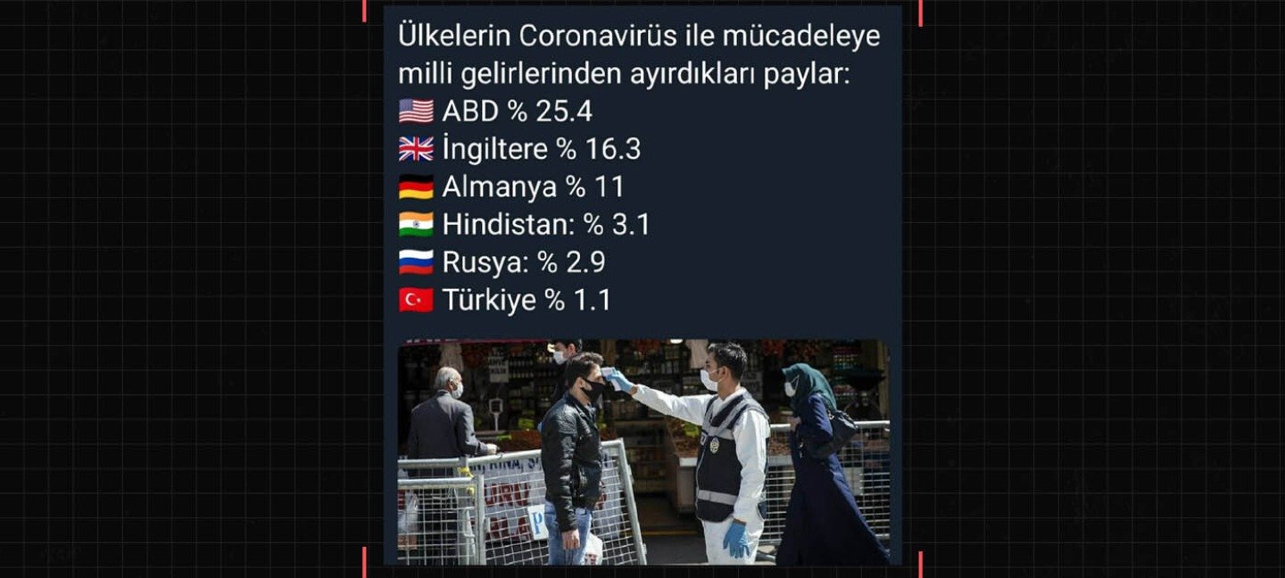 Bir Instagram hesabı tarafından 29 Nisan 2021 tarihinde yapılan paylaşımda ülkelerin koronavirüs ile mücadeleye milli gelirlerinden ayırdıkları paylara değinildi. Paylaşımda ABD’nin koronavirüs ile mücadele için milli gelirinin %25,4’ü kadar bir pay ayırdığı, İngiltere’nin %16,3, Almanya’nın %11, Hindistan’ın %3,1, Rusya’nın %2,9 ve Türkiye’nin de %1,1’lik pay ayırdıkları iddia edildi. Paylaşım 3 bine yakın beğeni alırken, 260 da yorum toplamış.