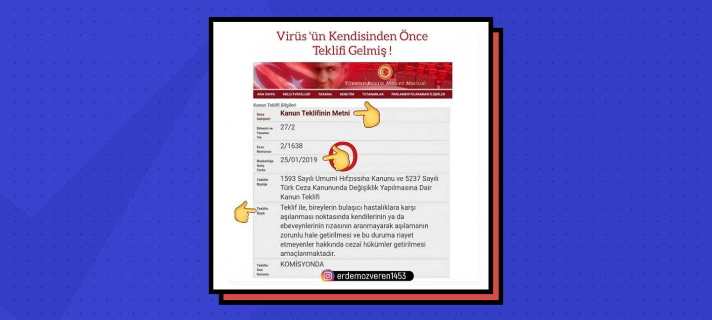 Yapılan paylaşımdaki kanun teklifine TBMM’nin kanun teklifleri sorgu formundan ulaşılabiliyor. 25 Ocak 2019 tarihinde 1593 Sayılı Umumi Hıfzıssıhha Kanunu ve 5237 Sayılı Türk Ceza Kanunu’nda Değişiklik Yapılmasına Dair Kanun teklifi sunuldu. CHP Ankara Milletvekili Gamze Taşçıer tarafından sunulan bu kanun teklifi şu şekilde: “Bireylerin bulaşıcı hastalıklara karşı aşılanma noktasında kendilerinin ya da ebeveynlerinin rızasının aranmayarak aşılamanın zorunlu hale getirilmesi ve bu duruma riayet etmeyenler hakkında cezai hükümler getirilmesi amaçlanmaktadır.”