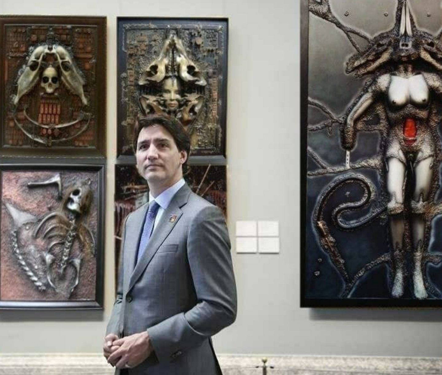 Paylaşımda yer alan fotoğrafların 2022 NATO Zirvesinde “satanist” sanat eserleriyle fotoğraflanan dünya liderlerini gösterdiği iddiası yanlıştır.