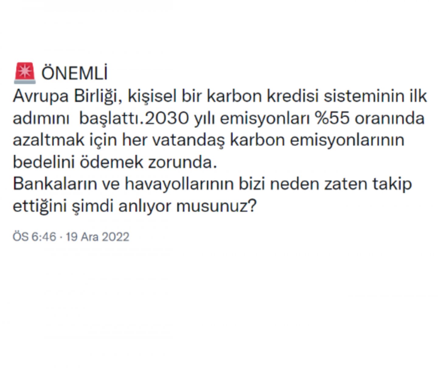 Bir Twitter hesabı tarafından 19 Aralık 2022 tarihinde yapılan bir paylaşımda, Avrupa Birliği’nin kişisel bir karbon kredisi sistemini uygulamaya karar verdiğini ve kişilerin karbon emisyonlarının kullanım bedelini ödemek zorunda kalacağını iddia edildi.