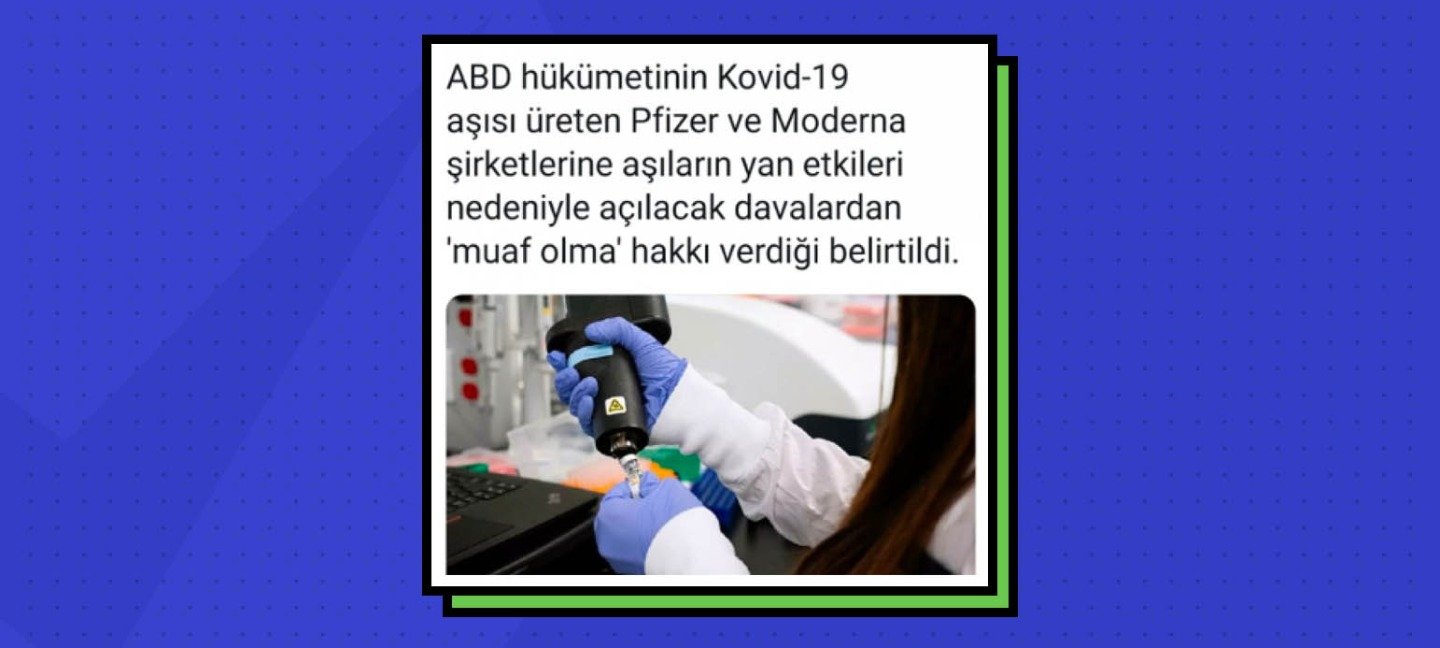 Bir Facebook sayfası tarafından 18 Aralık 2020 tarihinde yapılan paylaşımda ABD hükümetinin COVID-19 aşısı üreten Pfizer ve Moderna şirketlerine aşıların yan etkileri nedeniyle açılacak davalardan muaf olma hakkı verdiği iddia edildi. Gönderi 82 binden fazla görüntülenme 570’ten fazla paylaşım almış.