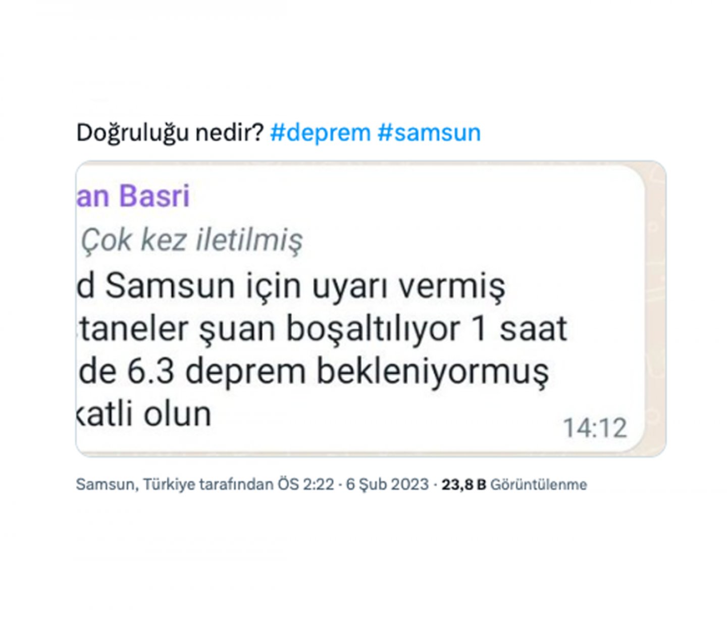 Bir Twitter hesabı tarafından 6 Şubat 2023 tarihinde yapılan paylaşımda AFAD Samsun’un bir saat içinde deprem olacağına ilişkin resmi açıklama yaptığı iddia edildi.