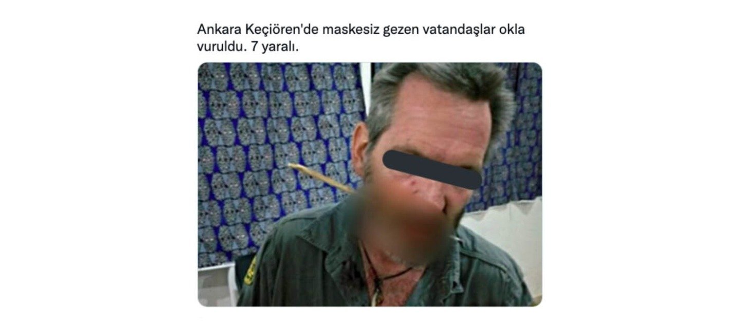 21 Ağustos’ta bir Twitter hesabı tarafından Ankara Keçiören’de maskesiz gezen vatandaşların okla vurulduğu ve 7 kişinin yaralandığı iddia edilmişti. Haber parodi nitelikli içerikler paylaşan bir Twitter hesabı tarafından dolaşıma sokulmuş. Fakat gönderi yayıldıkça kullanıcılar paylaşımı gerçek bir haber olarak paylaşmaya başlamışlar. İddiada kullanılan görsel araştırıldığında da farklı dilde haber yapan siteler tarafından kullanıldığı anlaşılıyor.