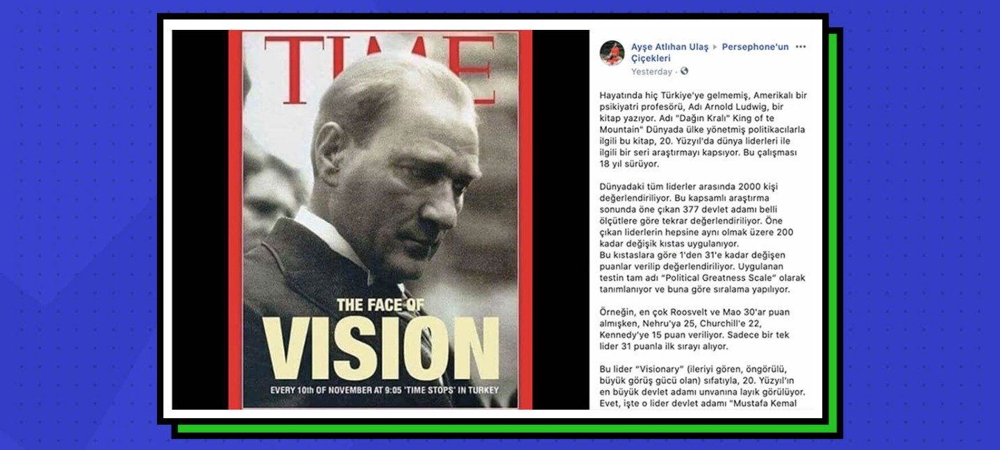 Bir Facebook kullanıcısının 29 Ağustos 2020’de paylaştığı gönderide Arnold Ludwig isimli bir psikiyatri profesörünün araştırmasına göre Mustafa Kemal Atatürk’ün 20. yüzyılın en büyük devlet adamı olduğu iddia edildi. Gönderi 75 bine yakın görüntülenme ve 2 bine aşkın paylaşım aldı.