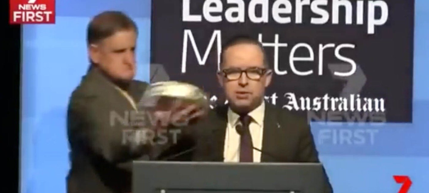Videoda yüzüne pasta atılan kişi, Avustralya'nın Perth kentinde düzenlenen bir etkinlikte konuşan Qantas havayolu şirketinin CEO’su Alan Joyce. Tanımadığı bir kişi tarafından yüzüne pasta atılan Joyce, yeni başladığı konuşmasına olaydan sonra ara vermek zorunda kalmış. Protestocuya böyle bir eylemi neden yaptığı sorulduğunda ise Joyce’un eşcinsel evliliğe verdiği destek nedeniyle böyle bir protesto yoluna gittiğini söylemiş. Devamında Joyce, protestocuya dava açmış ve protestocu 3.600 dolarlık bir cezanın yanında The Qantas havayolundan ömür boyu uçuş yasağı cezası almış.
