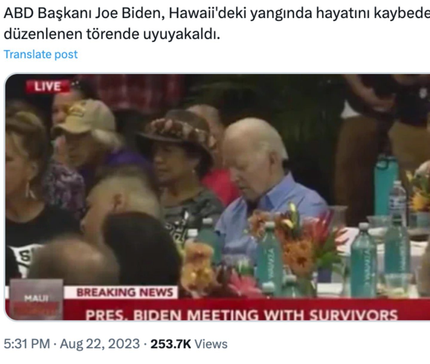 Bir Twitter hesabı tarafından 22 Ağustos 2023 tarihinde yapılan bir paylaşımda ABD Başkanı Joe Biden’ın Hawaii’nin Lahaina kasabasında yangınlar nedeniyle yapılan bir etkinlikte uyuyakaldığı iddia edilmişti.