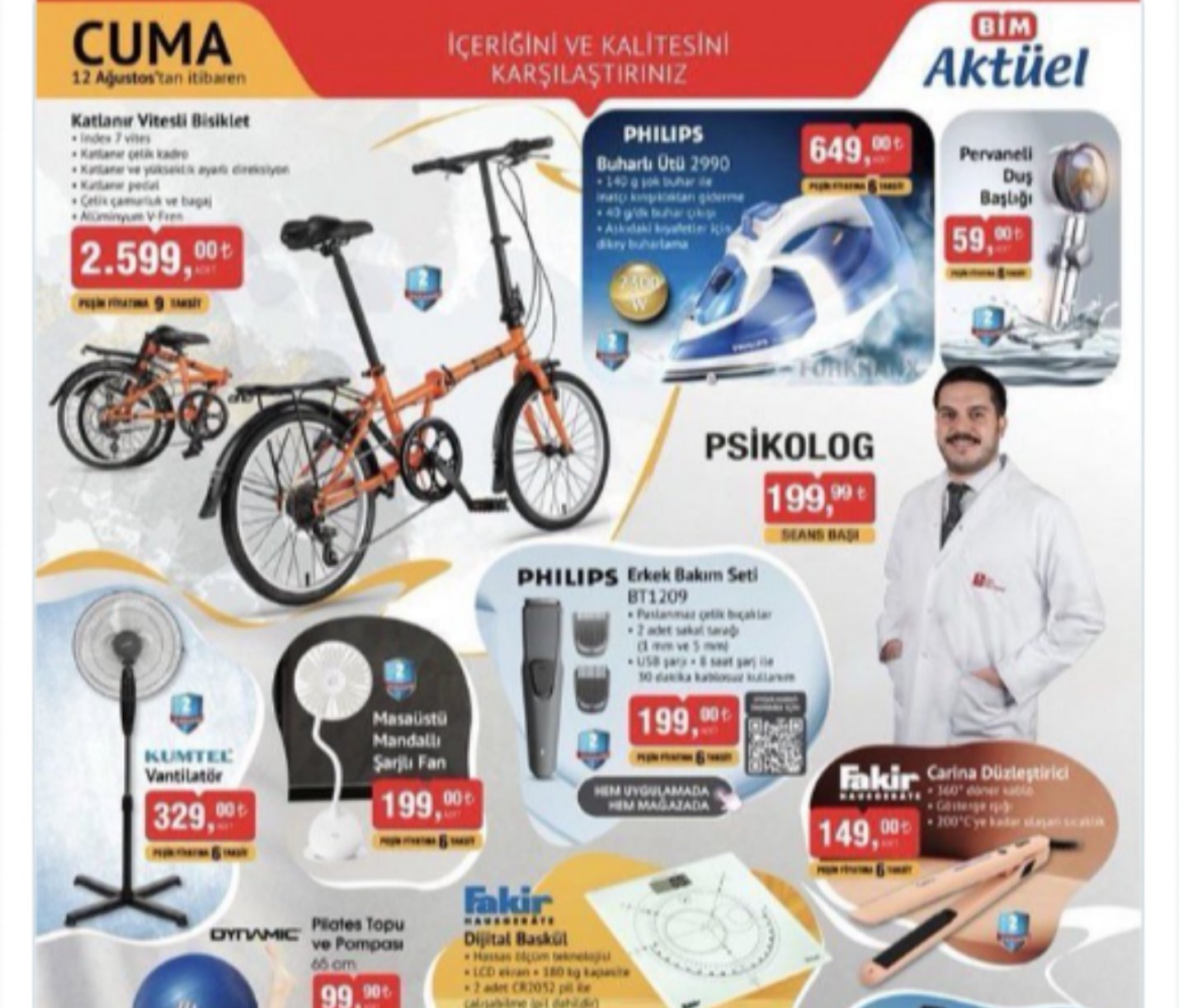 Bir Twitter hesabı tarafından yapılan paylaşımda BİM Aktüel ürün kataloğunda seans ücreti 200 lira olan psikolog hizmeti yer aldığı iddia edilmişti. Söz konusu görsel, 12 Ağustos BİM Aktüel kataloğuna ait. Katalog incelendiğinde, erkek bakım setinin dijital olarak değiştirilerek yerine psikolog seansı eklendiği görülüyor.