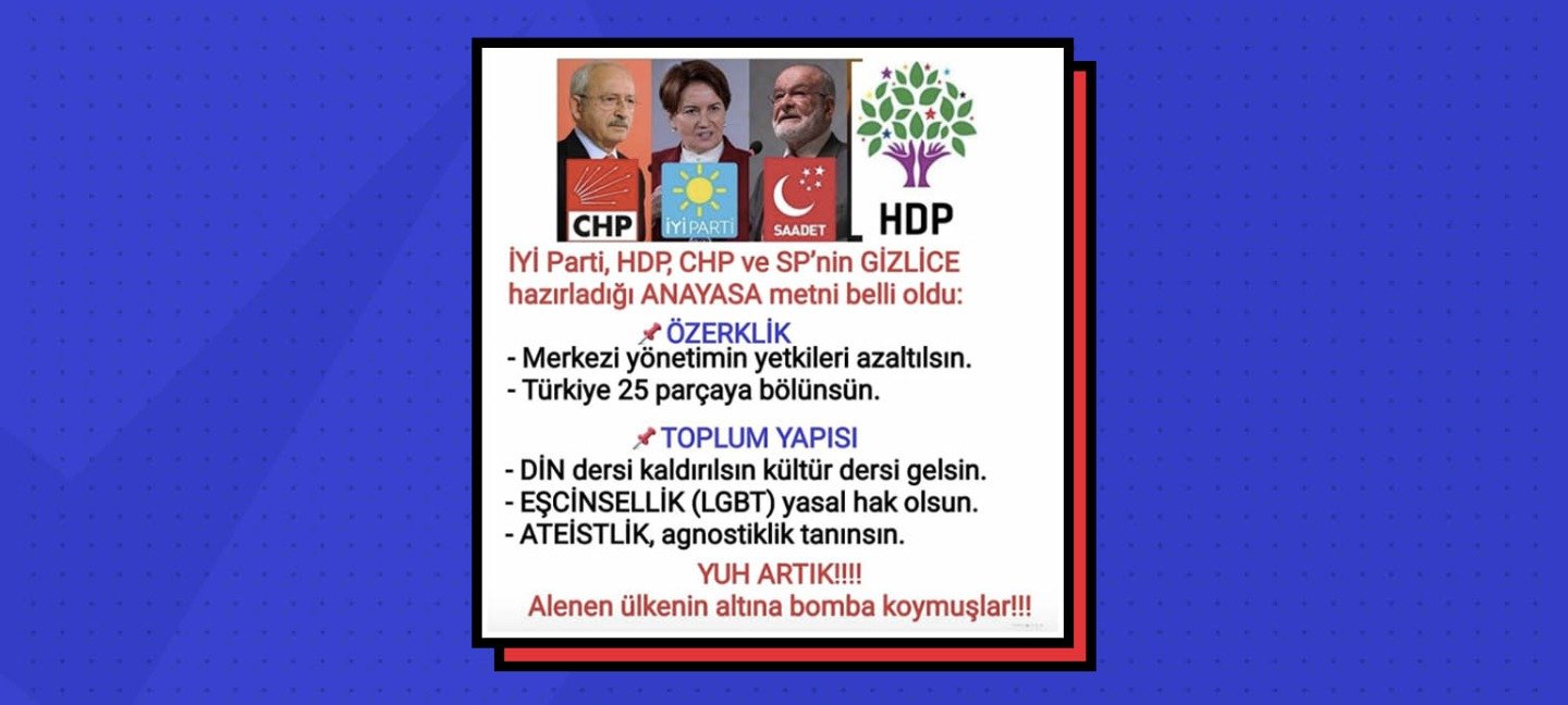 Paylaşımda geçen metin şu şekilde: "İYİ Parti, HDP, CHP ve SP’nin gizlice hazırladığı anayasa metni belli oldu… Özerklik: Merkezi yönetimin yetkileri azaltılsın, Türkiye 25 parçaya bölünsün. Toplum yapısı: Din dersi kaldırılsın, kültür dersi getirilsin. Eşcinsellik (LGBT) yasal hak olsun. Ateistlik, agnostiklik tanınsın."Paylaşım daha önce sosyal medyada gündeme gelmesinin yanında çeşitli internet siteleri tarafından da paylaşılmış.