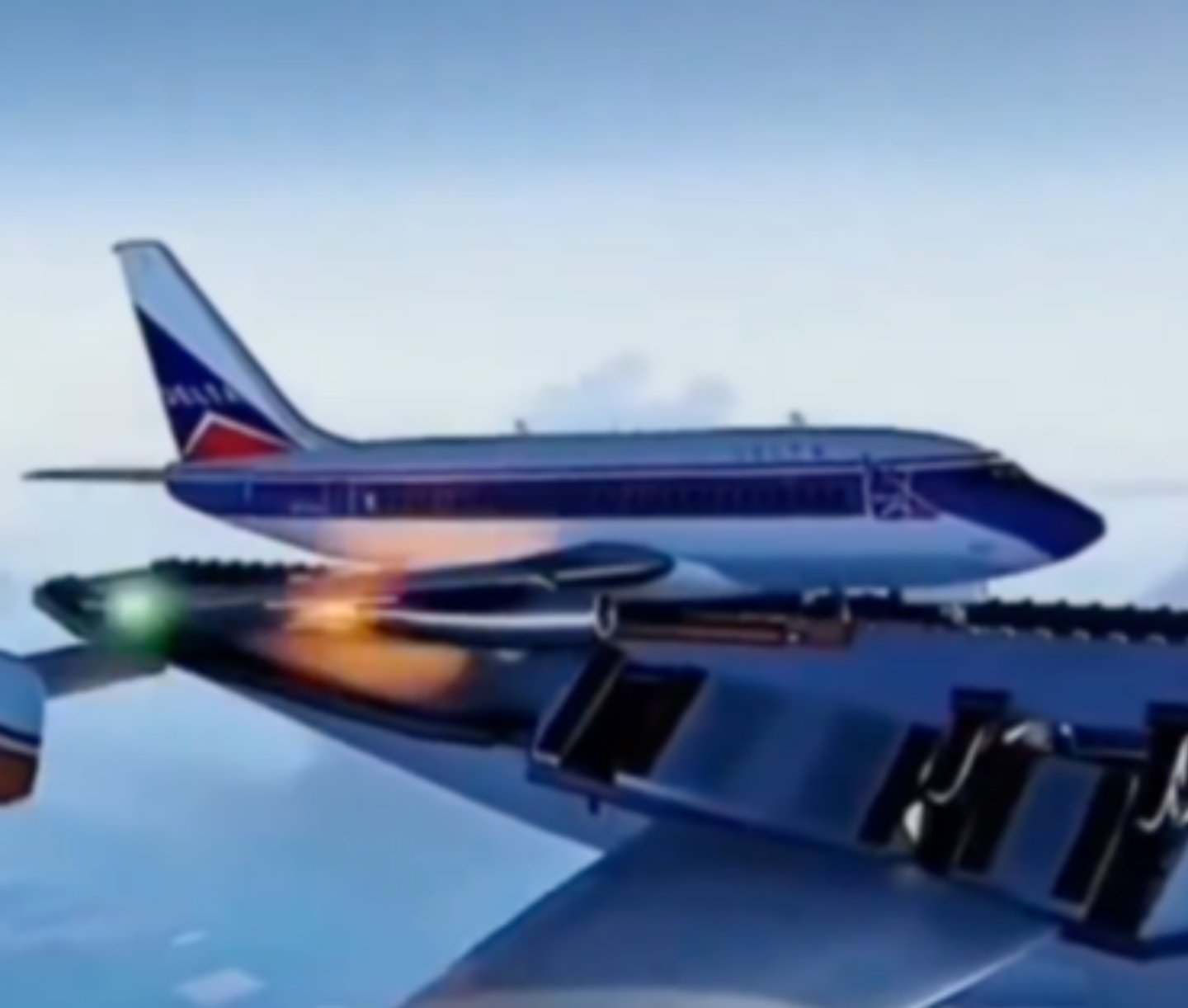 Videodaki uçak, 1961’de sadece patent aşamasında kalan, havada başka uçakları “yakalamayı” amaçlayan teorik bir uçan platform tasarımı.