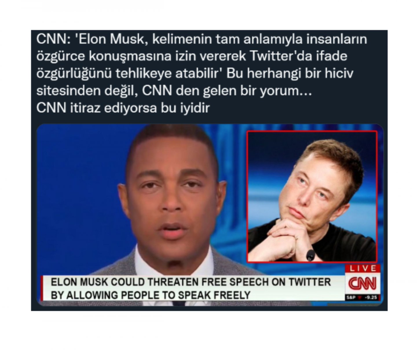 Bir Twitter hesabı tarafından 9 Nisan 2022 tarihinde yapılan bir paylaşımda, CNN’in Elon Musk ile ilgili yaptığı bir haberde Elon Musk’ın Twitter’da ifade özgürlüğünü tehlikeye atabileceği iddia edildi.