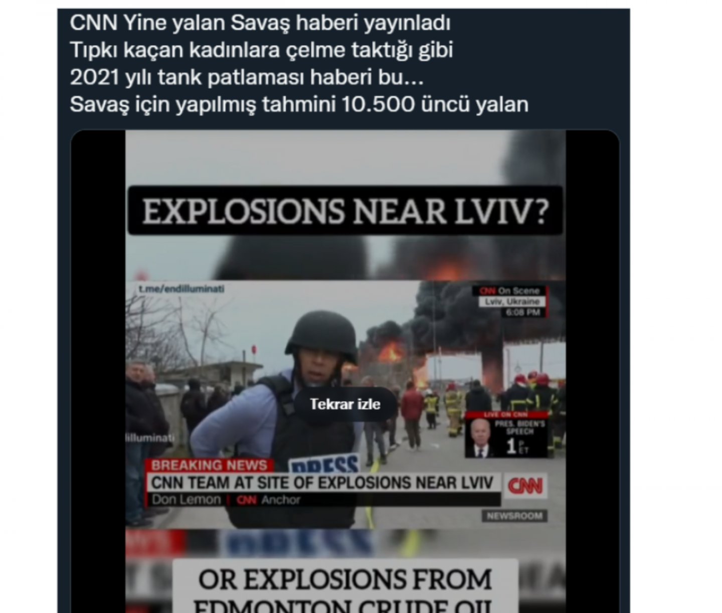 Bir Twitter hesabı tarafından 30 Mart 2022 tarihinde yapılan paylaşımda, CNN’in Ukrayna patlaması ile alakalı yaptığı bir haberin 2021 yılından kalma bir tank patlaması olduğu iddia edildi.