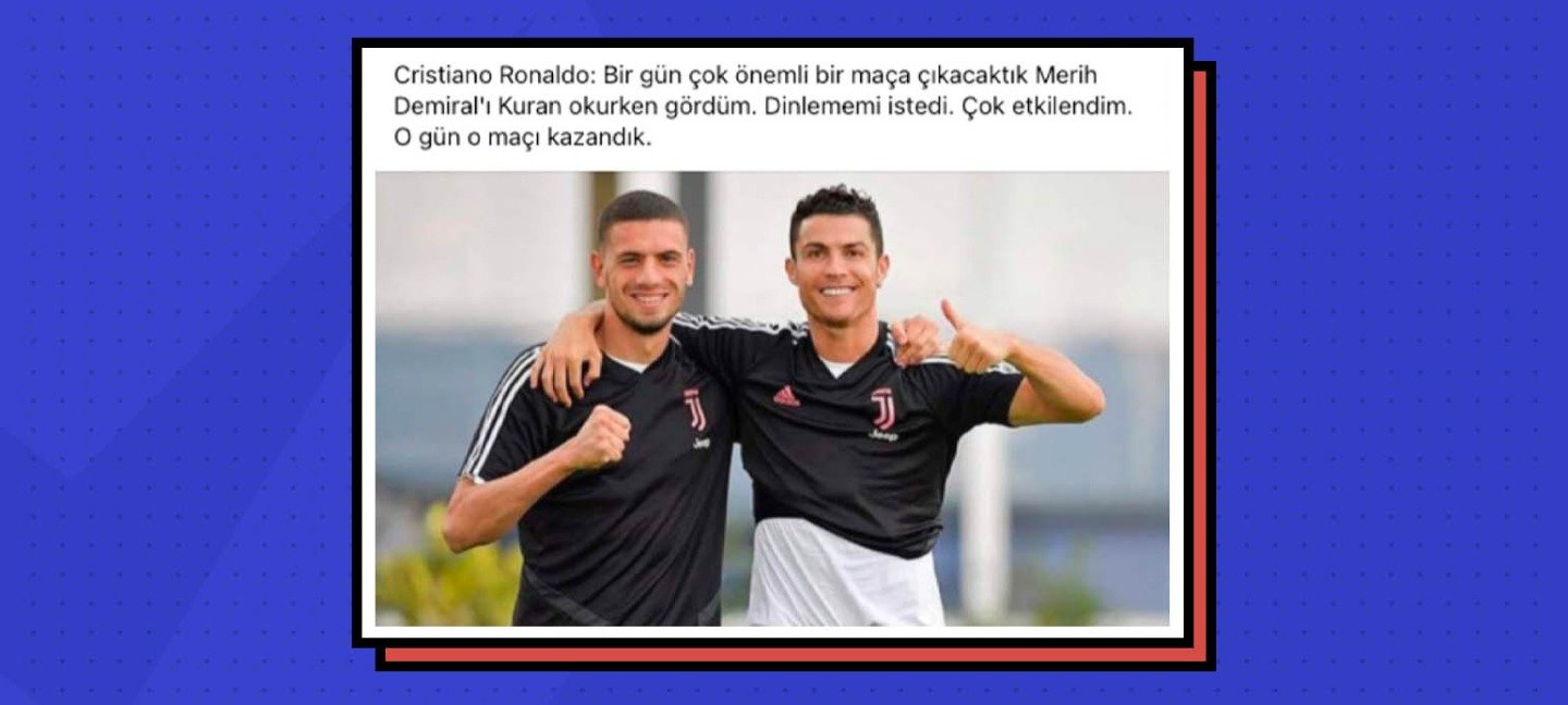 Bir Facebook kullanıcısı tarafından 2 Ocak 2021 tarihinde yapılan paylaşımda Cristiano Ronaldo’nun aynı takımda forma giydiği Türk futbolcu Merih Demiral’ı Kur’an-ı Kerim okurken gördüğünü, Merih Demiral’ın kendisini dinlemesi istediğini ve çok etkilendiğini, ardından da maçı kazandıklarını söylediği iddia edildi. Paylaşım Facebook’ta 1,6 milyon görüntülenme ve 54 bin beğeni alırken, paylaşım altına 930 da yorum yapılmış.