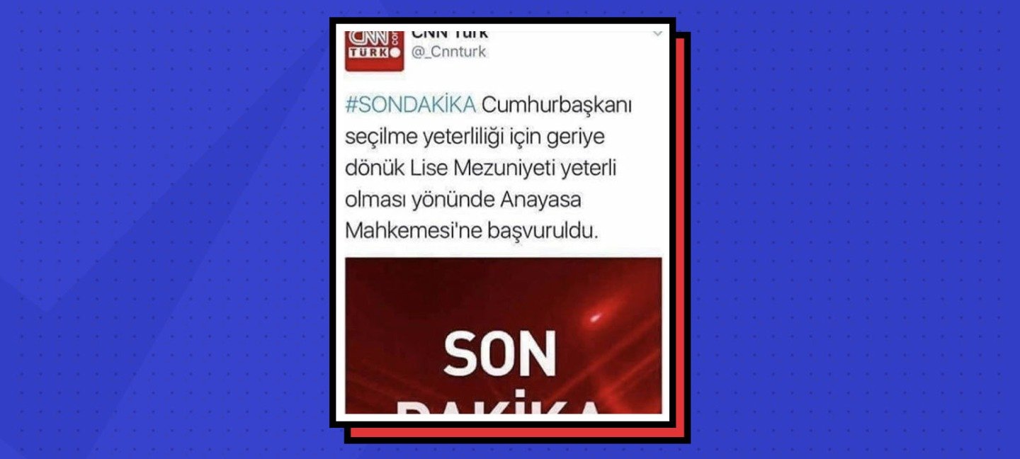 Paylaşılan görselde CNN Türk’ün twitter adresinden Cumhurbaşkanı seçilmek için lise mezuniyetinin yeterli olması yönünde Anayasa Mahkemesi’ne başvuru yapıldığı paylaşımı yapılmış. Aynı zamanda başvuru içinde olası kararın geriye dönük olarak işlemesi için bir talep de var.