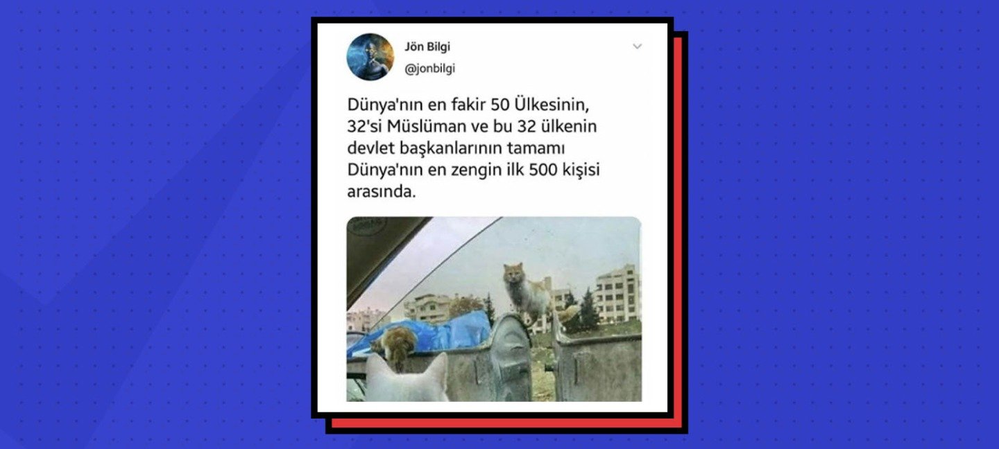 Bir Facebook kullanıcısının 28 Temmuz 2020 tarihinde paylaşmış olduğu bir görselde dünyanın en fakir 50 ülkesinden 32’sinin Müslüman olduğunu ve bu ülkelerin devlet başkanlarının da dünyanın en zengin 500 kişisi arasında olduğunu iddia edildi. Paylaşım 1,1 milyon görüntülenme ve yaklaşık 34 bin de beğeni aldı.