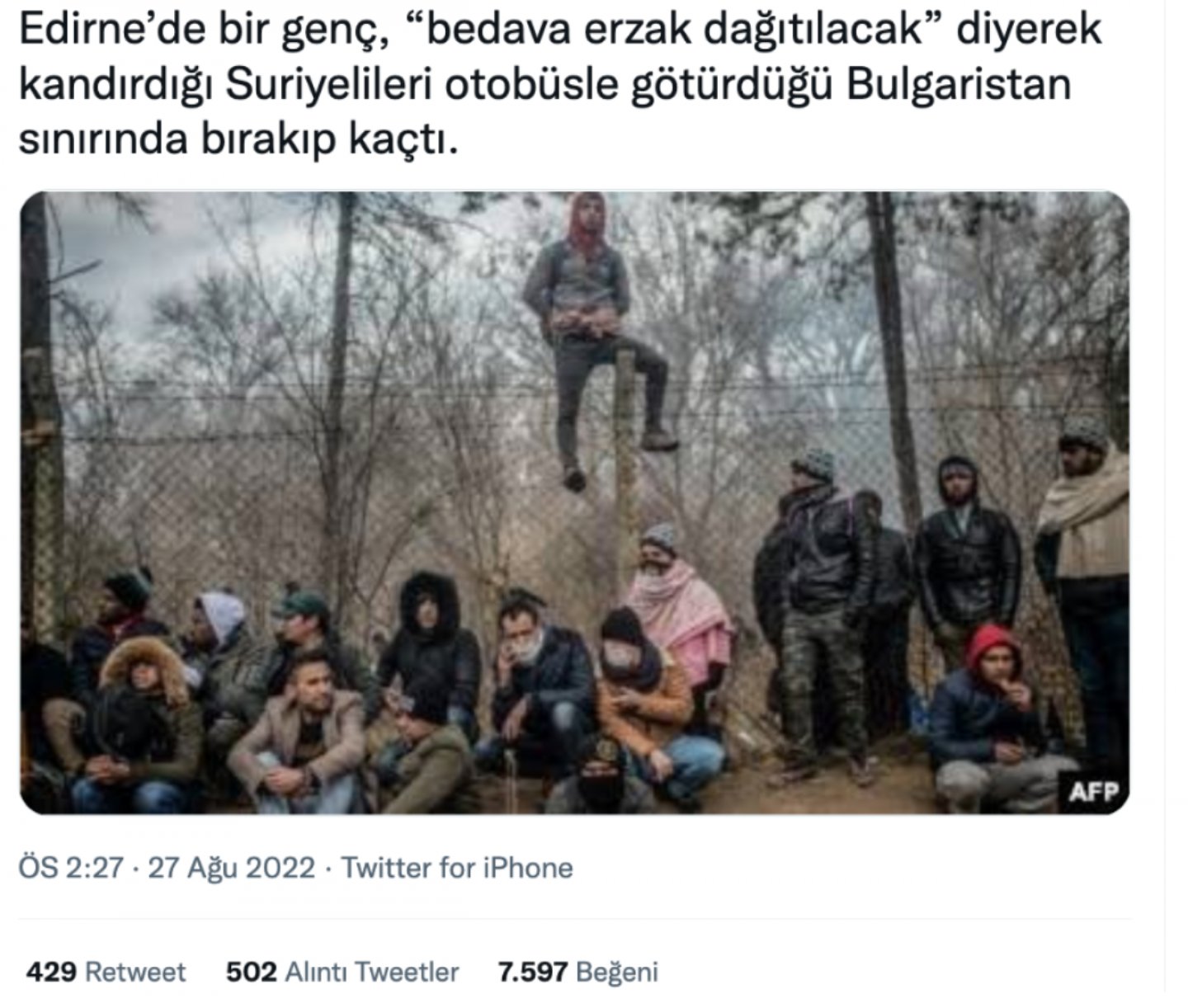 Edirne’de bir gencin Suriyelileri "bedava erzak var" diyerek kandırıp Bulgaristan sınırında bırakıp kaçtığı iddiası yanlış.