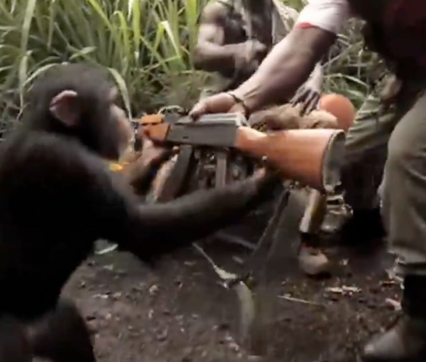 Bir Instagram kullanıcısı tarafından 28 Mayıs 2024’te yapılan bir paylaşımda yer alan videoda, eline makineli tüfek verilen bir maymunun tüfeği kendisine veren insanları taradığı iddia edildi.