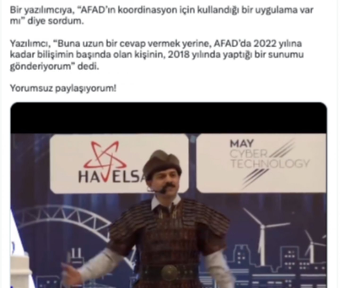 Bir Twitter hesabı tarafından 12 Şubat 2023 tarihinde yapılan paylaşımda Eski AFAD Bilgi Sistemleri ve Haberleşme Daire Başkanı'nın okçuluk kostümüyle sunum yaptığı iddia edildi.