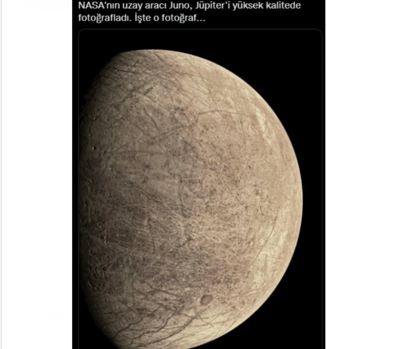 Bir Twitter hesabı tarafından yapılan bir paylaşımda, fotoğrafın Jüpiter’e ait olduğu iddia edilmişti. Fotoğrafı NASA’nın internet sitesinden bulmak mümkün. NASA’nın sitesinde verilen bilgiye göre fotoğraf Jüpiter’in uydularından Europa’ya ait.