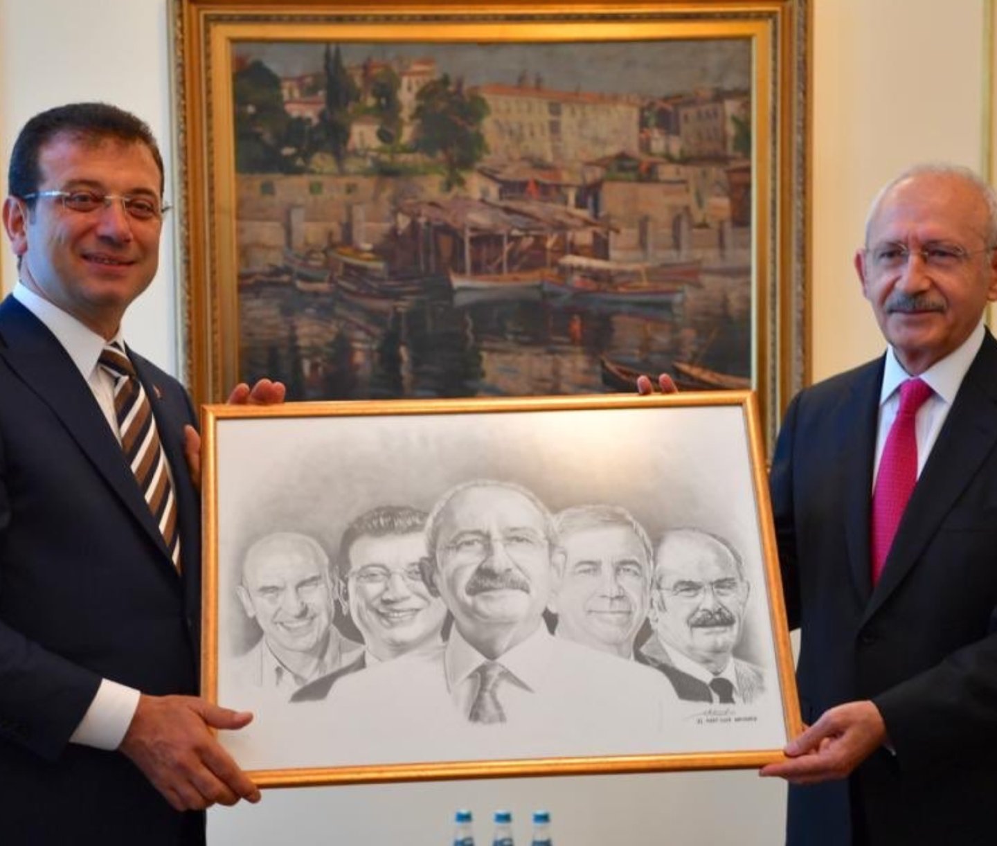 Fotoğrafın orijinalinde yer alan tabloda, İzmir, İstanbul, Ankara ve Eskişehir Büyükşehir Belediye başkanları ile birlikte Kemal Kılıçdaroğlu'nun karakalem ile çizilmiş resmi bulunuyor.