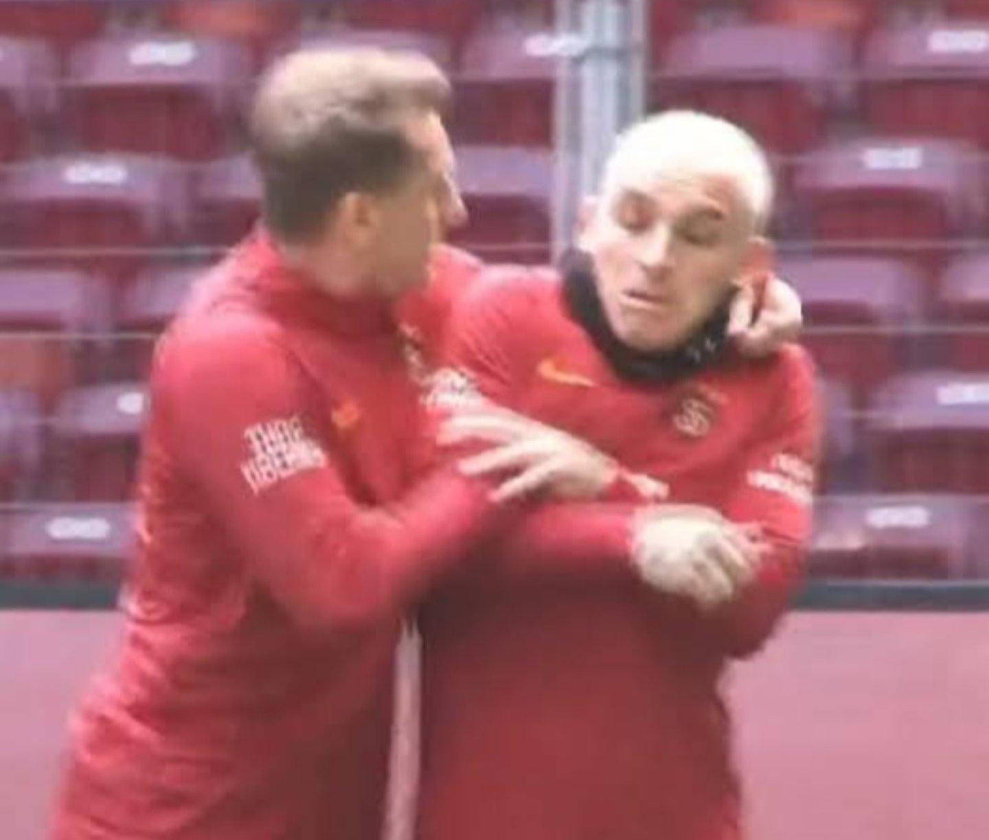 Görüntülerin Galatasaray-Kopenhag Şampiyonlar Ligi maçı öncesi Galatasaray futbolcuları Kerem Aktürkoğlu ve Lucas Torreira arasındaki kavgayı gösterdiği iddiası yanlış.
