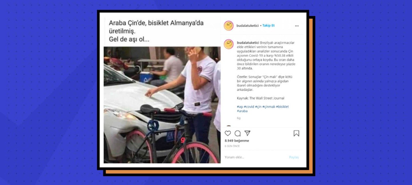 Bir Instagram sayfasında 13 Ocak 2021 tarihinde paylaşılan fotoğrafta bir arabayla bisikletin karıştığı kazada hasarlı olan arabanın Çin yapımı bisikletin de Alman yapımı olduğu iddia edildi. Bu iddianın yanında ise The Wall Street Journal Gazetesi kaynak gösterilerek Brezilyalı araştırmacıların Çin aşısının Covid-19’a karşı %50.38 etkili olduğunu ve bu oranın daha önce bildirilen oranın neredeyse %30’un altında olduğu iddia edilmiş. Paylaşım 1 milyonun üzerinde görüntülenme ve 8.949 beğeni almış.