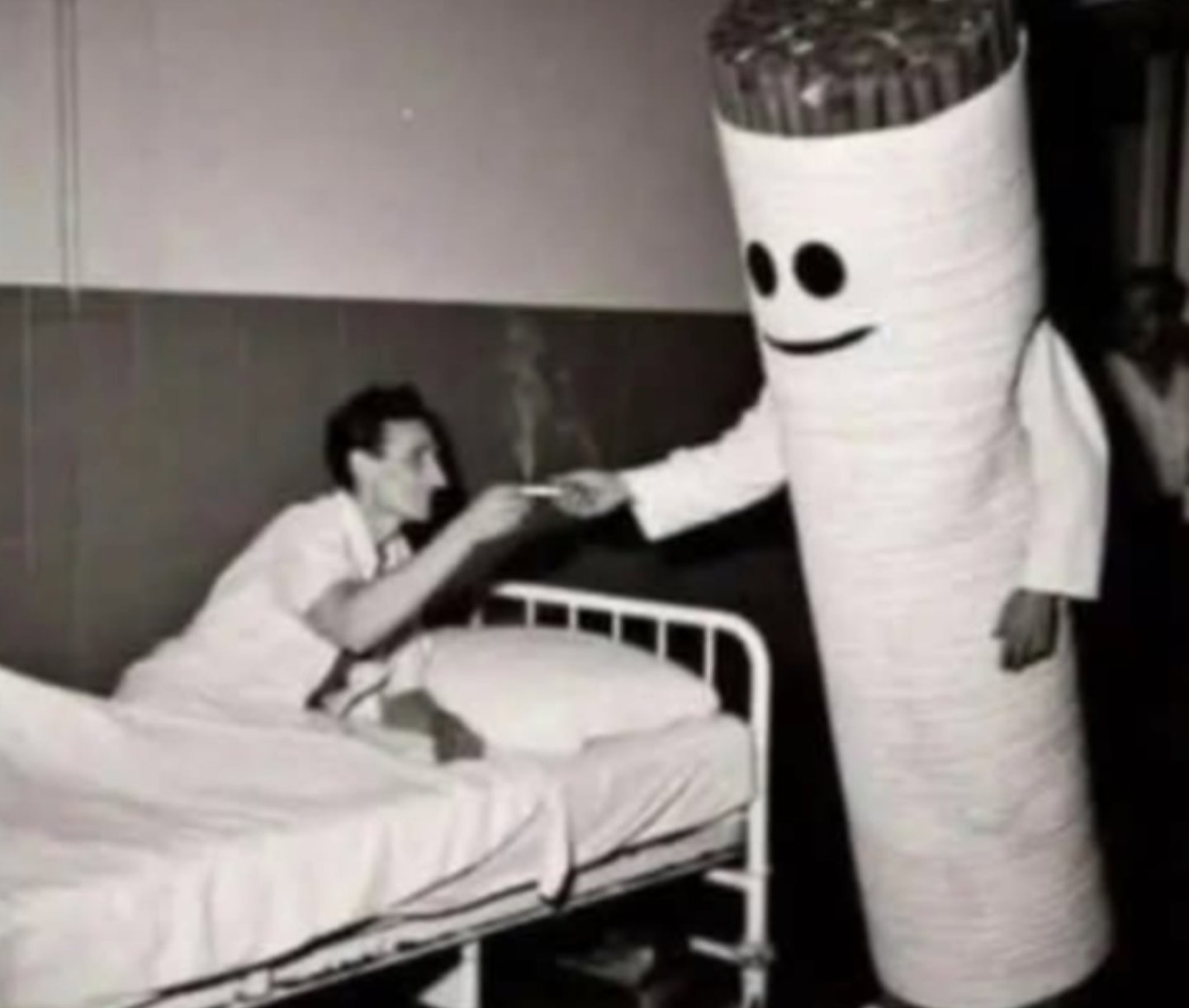 1940’lı yıllarda ABD hastanelerinde hastalara sigara dağıtan maskot görseli de sosyal medyada bir süredir dolaşımda. Siyah-beyaz olarak paylaşılan görsel ilk bakışta oldukça gerçekçi görünse de görselde yer alan bazı detaylar dikkat çekiyor. Maskotun hastaya uzattığı sigara incelendiğinde, sigaranın izmarit bölümü belirsizken, yanan bölümünün hasta tarafından elle tutulduğu görülüyor. Bunun yanında, yatakta da belli bozulmalar göze çarpıyor. Uzanan hastanın bel ve altında kalan bölüm yatakta yer almazken, yatağın ayak tarafındaki çarşaf yükseltisinin vücut bütünlüğüne aykırı bir şekilde olduğu görülüyor. Bir diğer bozulma ise sigara maskotunun sol elinde görülebilir. Maskotun sol elindeki detaylarda, yüzük ve serçe parmaklarında ayrıklık yer almazken işaret ve orta parmaklar el yapısına göre oldukça kısa.