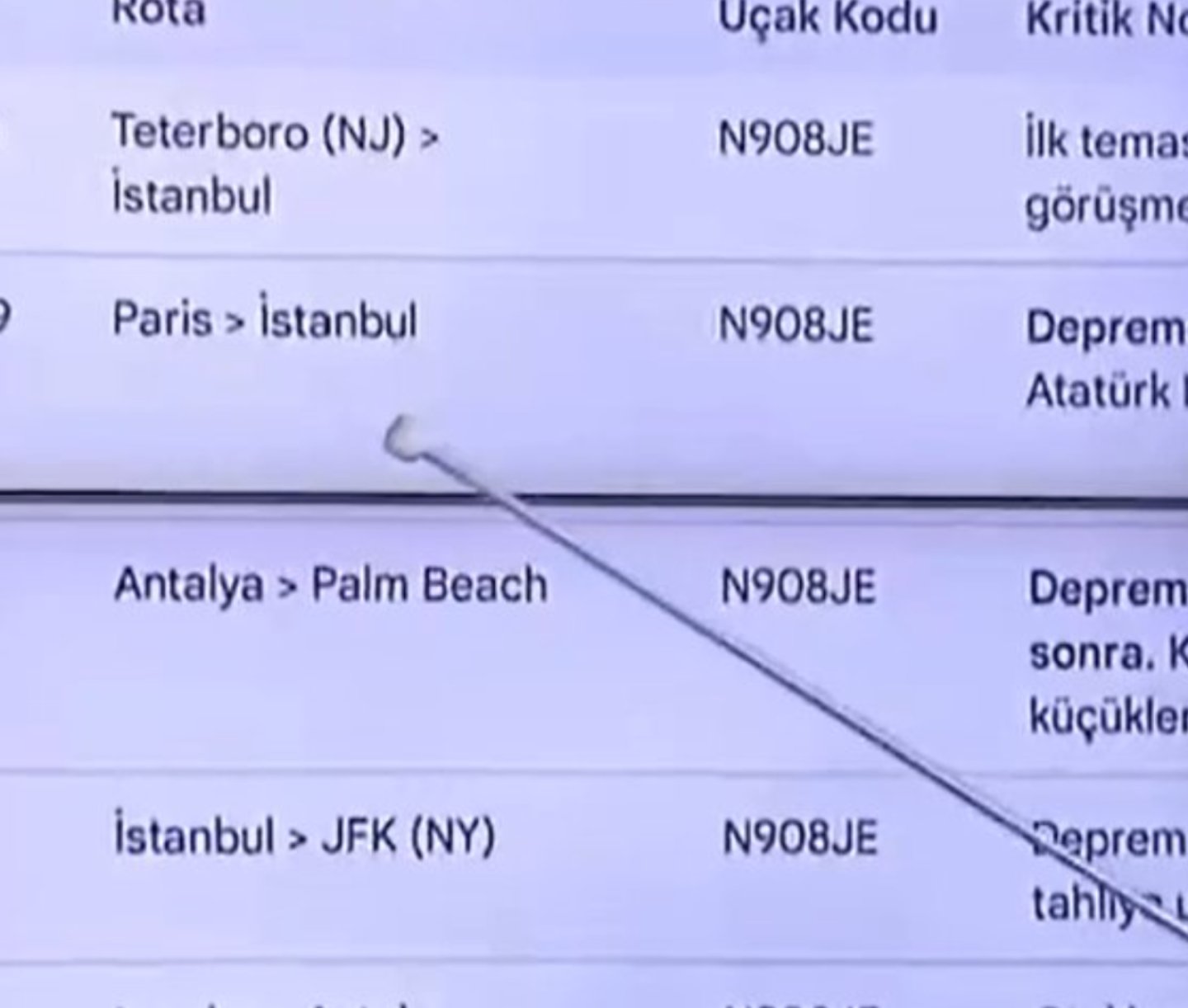 Görseldeki tabloya göre Epstein’in N908JE kuyruk numaralı uçakla 17 Ağustos 1999 Gölcük Depremi’nden bir gün önce Paris’ten İstanbul’a geldiği, depremden 27 gün sonra ise Antalya’dan Palm Beach’e uçtuğu ve bu uçuşa “refakatsiz küçükler” notu eklendiği iddia ediliyor. Ancak Epstein’in resmi uçuş kayıtları incelendiğinde bu bilgilerin gerçeği yansıtmadığı görülüyor.