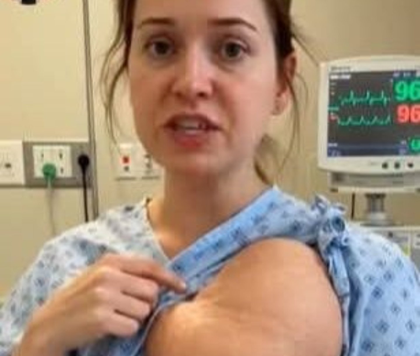 Videoda, hastane ortamında önlük giymiş bir kadın görülüyor. Kadının yüzündeki endişeli ifade dikkat çekerken, göğsünde belirgin bir şişlik olduğu fark ediliyor.