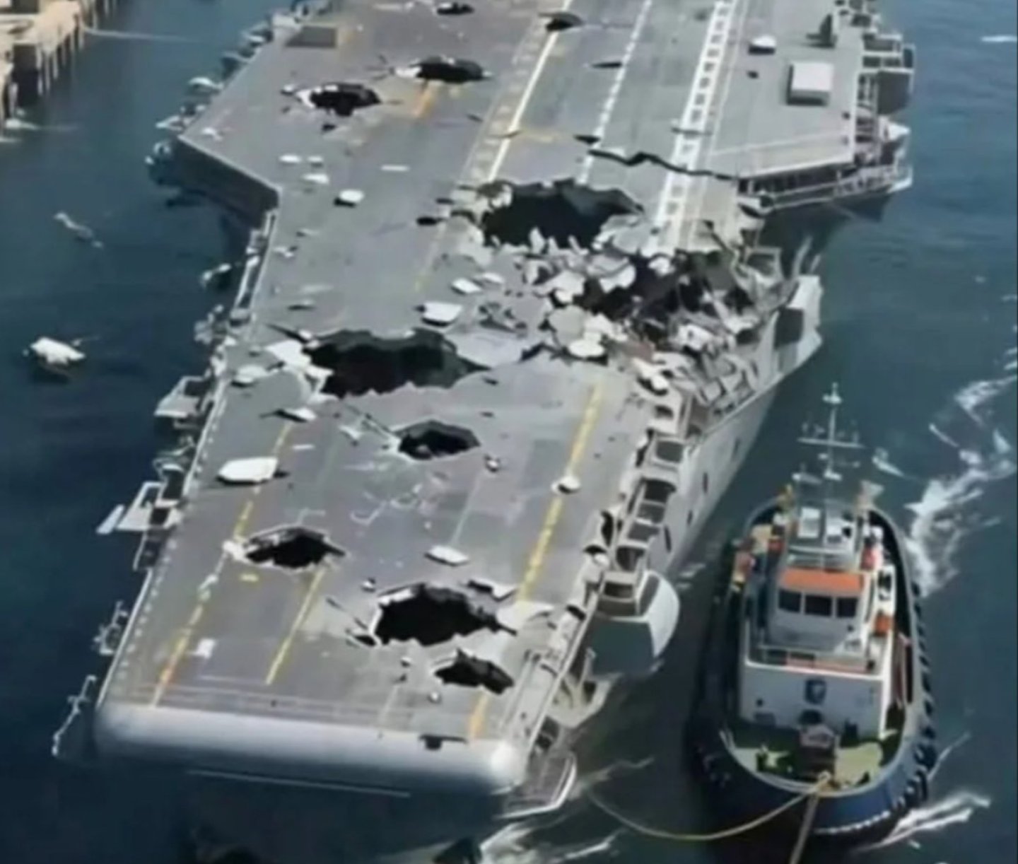Görselde ise oldukça zarar görmüş bir uçak gemisi görülüyor. Pistindeki saldırı izleri ile beraber uçak gemisi limana bir römorkör ile çekilmekte. Bu sahneden uçak gemisinin oldukça hasarlı ve kullanılamaz durumda olduğunu anlaşılıyor. Bu saldırının kaynağının ise görsel ile paylaşılan “İşte Yemen Husilerin başarıları… Amerika saklasa da olay budur👇” cümlesi ile husilerin olduğu belirtilmiş.
