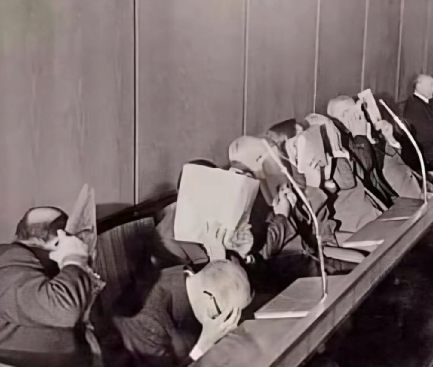 Fotoğraf “Treblinka Davası” başlığıyla paylaşılmış. Fotoğrafın açıklamasında “Nazi savaş suçları için 'Treblinka Davası'ndaki on sanık, 12 Ekim 1964'te Düsseldorf'ta yasal işlemlerin başlamasını beklerken yüzlerini fotoğrafçılardan ve kameramanlardan gizliyor. Bunların arasında eski SS adamları Kurt Franz, Otto Stadie, Heinrich Matthes, Willy Mentz, August Miete, Franz Suchomel ve Gustav Munzberger de var.” ifadeleri yer alıyor.