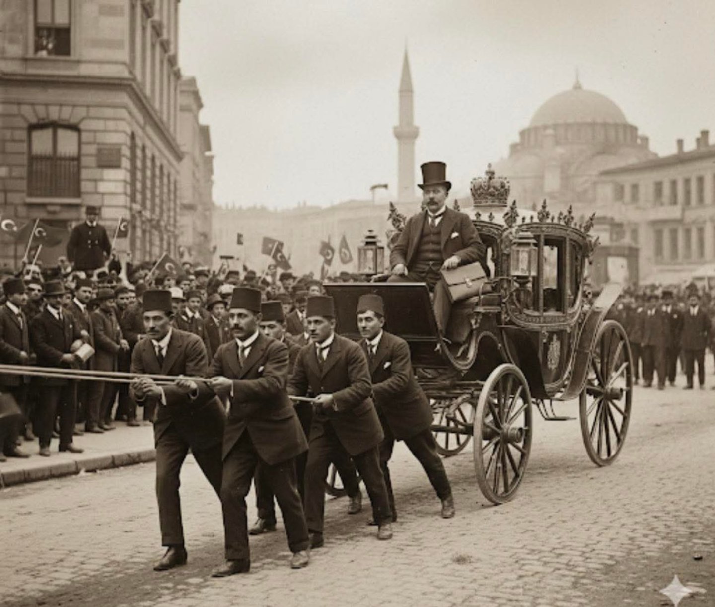 Görselin esinlendiği olayın ise kaynaklarda yer aldığı görülüyor. 1908’de II. Meşrutiyet’in ilanından sonra İstanbul’a gelen İngiliz Elçisi Gerald Lowther, kendisini karşılamaya gelen kalabalık içindeki bir grup genç tarafından arabasıyla birlikte çekilerek karşılanmış.