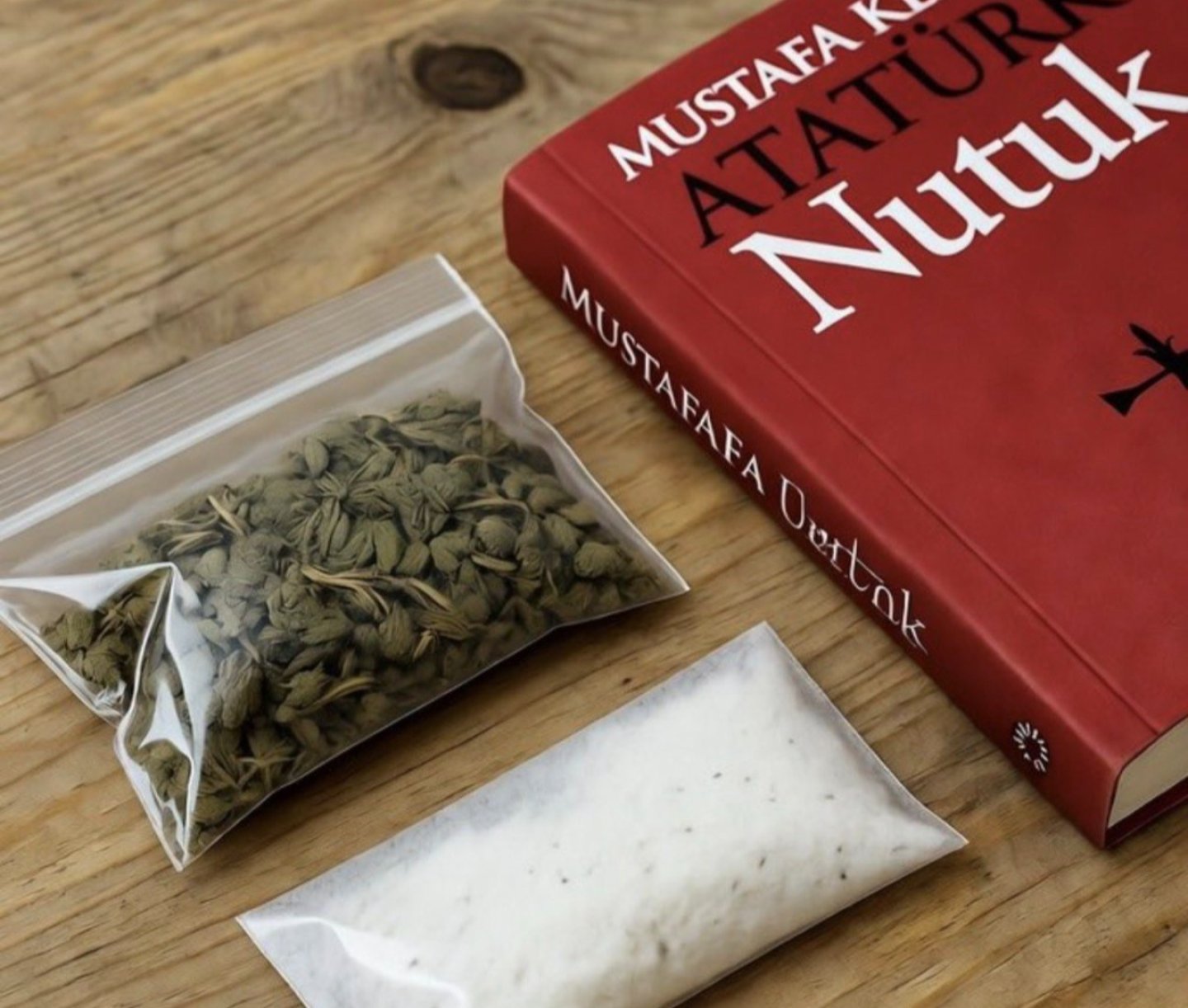 Görselin gözaltına alınan sanatçıların evlerinde yapılan aramada ele geçirilen Nutuk ve uyuşturucuyu gösterdiği iddiası yanlış.