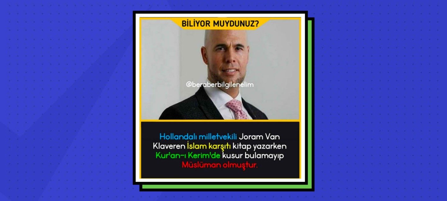 Bir Instagram sayfası tarafından 13 Ocak 2021 tarihinde yapılan paylaşımda Hollandalı Milletvekili Joram Van Klaveren’in İslam karşıtı kitap yazarken Müslüman olduğu iddia edildi. 35 bini son 24 saatte olmak üzere toplam 1 milyon görüntülenme alan paylaşım, Instagram’da 25 binden fazla kere beğenilmiş.Paylaşımda kullanılan metin şu şekilde: