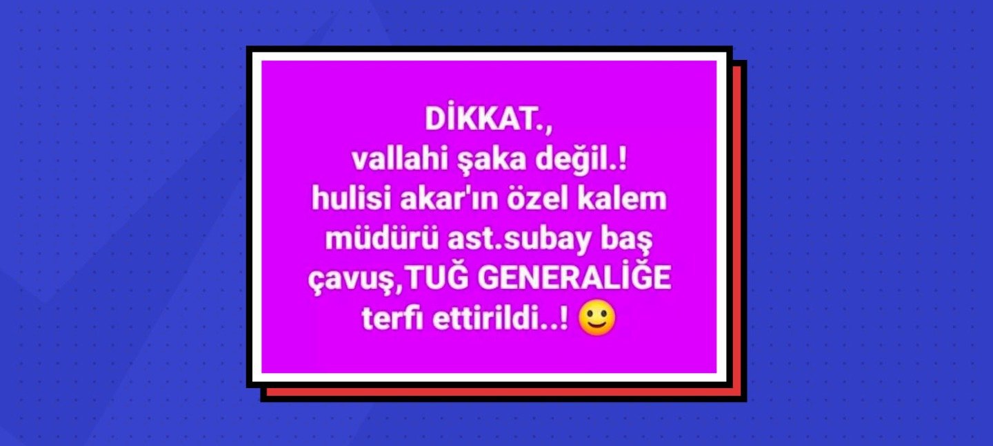 Bir Facebook kullanıcısının paylaştığı görselde Milli Savunma Bakanı Hulusi Akar’ın özel kalem müdürü astsubay başçavuşun tuğgeneralliğe terfi ettirildiği iddia edildi. Paylaşım 73 bin görüntülenme ve 2 bini aşkın paylaşım aldı.