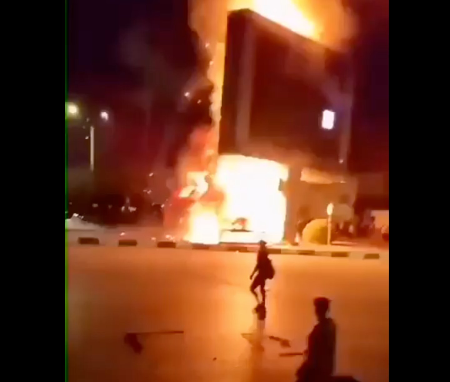 Video Eylül 2022 tarihinde gerçekleşen İran’daki eylemlerde Hamaney’in bilbord üzerinde duran fotoğrafının protestocular tarafından yakılma anını gösteriyor.