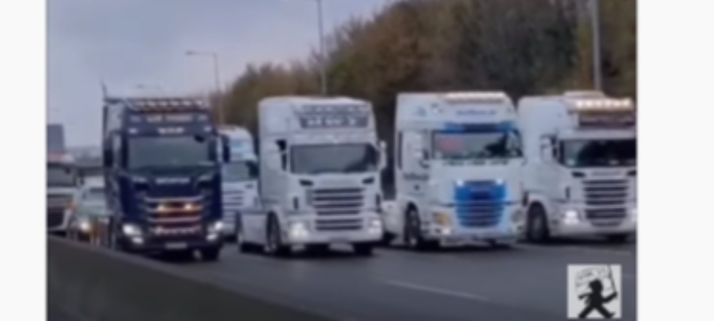 Youtube’daki bir sayfa aynı videoyu paylaşarak, videonun İrlandalı kamyon şoförlerinin yüksek akaryakıt fiyatlarını protesto etmek amacıyla yolu kapadığını yazmış.