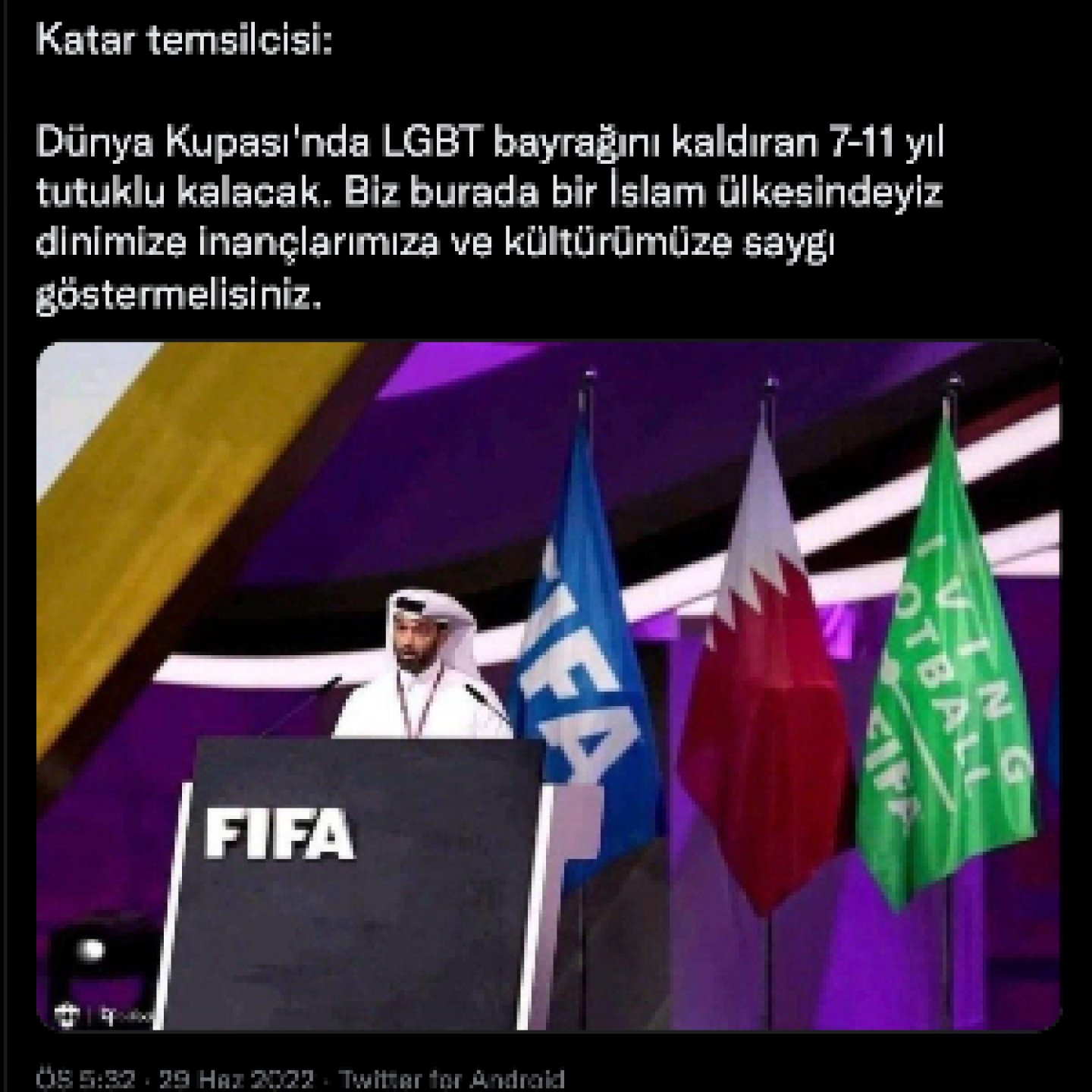 Katar’da düzenlenecek olan Dünya Kupası’nda LGBTI+ bayrakları taşıyanlara 7 ile 11 yıl arası hapis cezası verileceği iddiası yanlış.