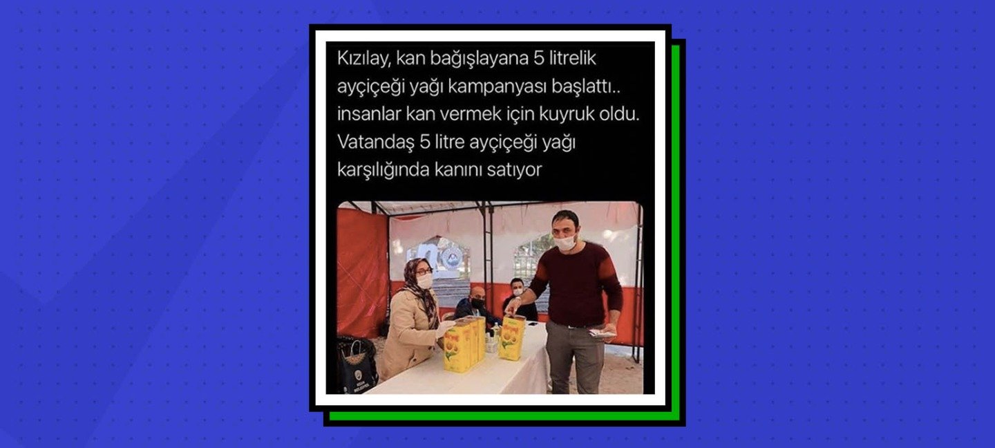 Bir Instagram sayfası tarafından 26 Ekim 2020 tarihinde yapılan paylaşımda Kızılay’ın kan bağışı yapanlara 5 litre ayçiçek yağı verdiği iddia edildi. Gönderi, 917 binden fazla görüntülenme almış.