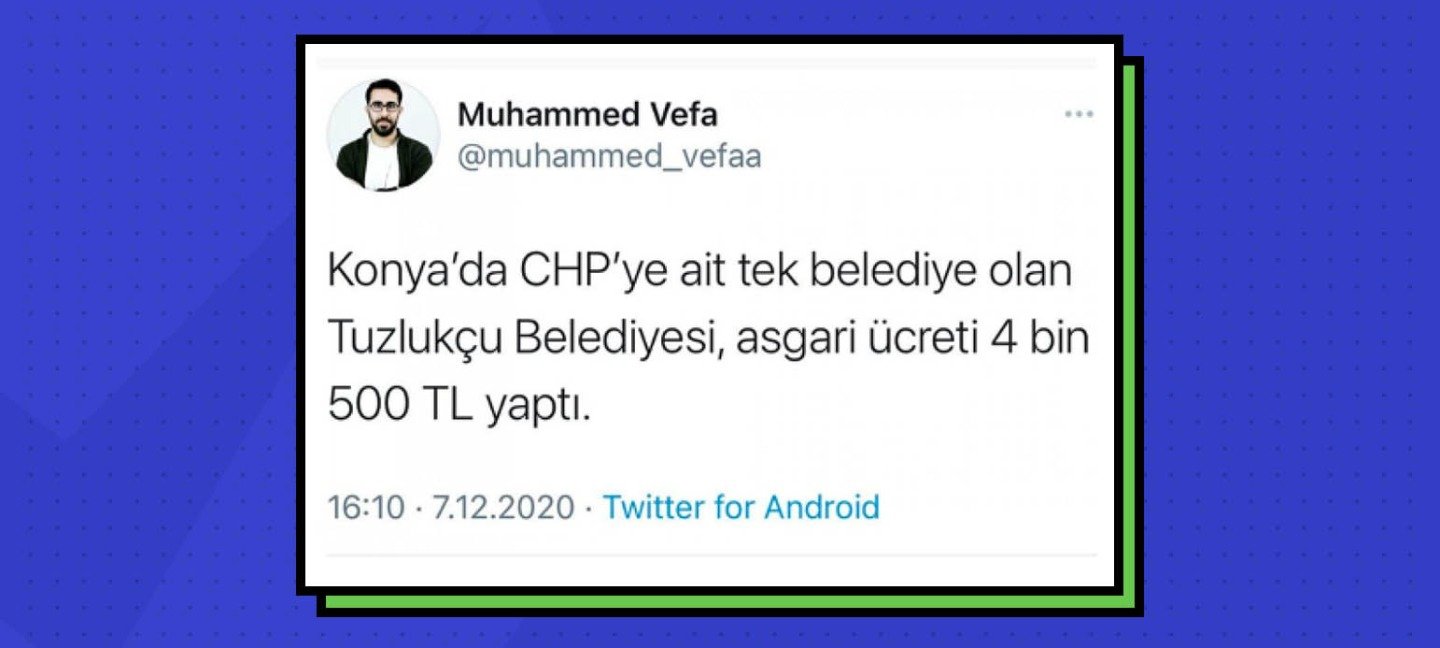 Bir Instagram sayfası tarafından 7 Aralık 2020 tarihinde yapılan paylaşımda, Konya’da CHP’ye ait tek belediye olduğu iddia edilen Tuzlukçu Belediyesi’nin asgari ücreti 4 bin 500 TL yaptığı iddia edildi. Gönderi 1 milyondan fazla görüntülenme aldı.
