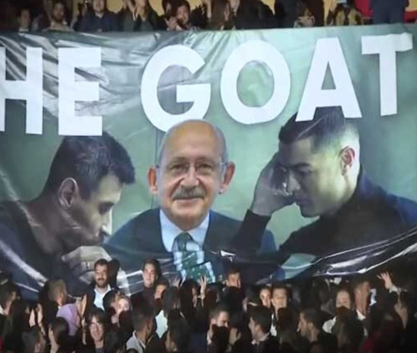 Millet İttifakı Cumhurbaşkanı adayı Kemal Kılıçdaroğlu’nun katıldığı Mevzular Açık Mikrofon programında Kılıçdaroğlu, Messi ve Ronaldo’yu birlikte gösteren ve “GOATS” yazan bir pankart açıldığı iddiası yanlış.