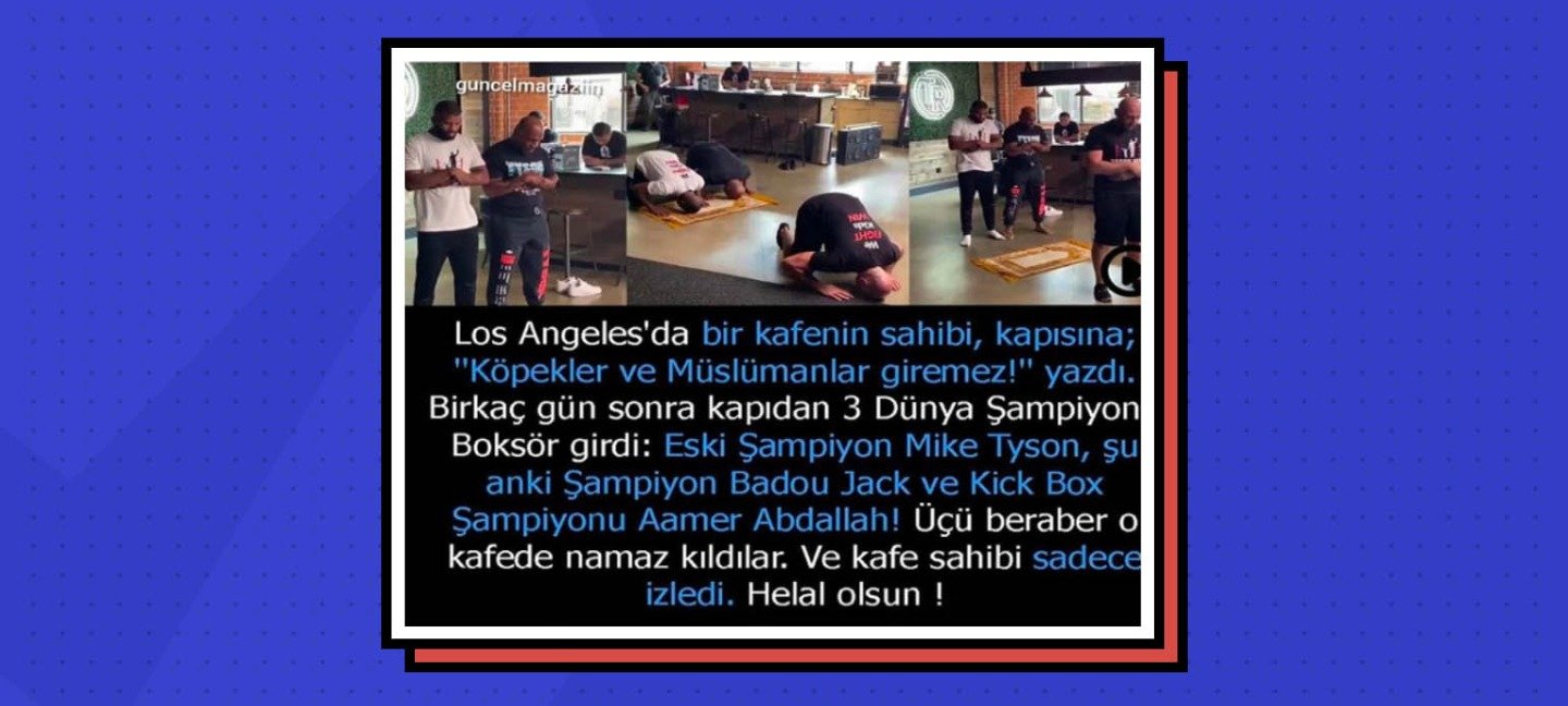 Bir Instagram sayfası 16 Ocak 2021 tarihinde yaptığı paylaşımda Los Angeles’ta bir kafenin kapısına “köpekler ve Müslümanlar giremez” yazıldığını iddia ederken aynı zamanda eski dövüş sporları şampiyonları Mike Tyson, Badou Jack ve Aamer Abdallah’ın da o kafeye giderek namaz kıldıklarını iddia etmiş. Paylaşım 3.300’den fazla beğeni almış. Paylaşım toplamda 436 bin, son 24 saatte 29 bin görüntülenme almış.