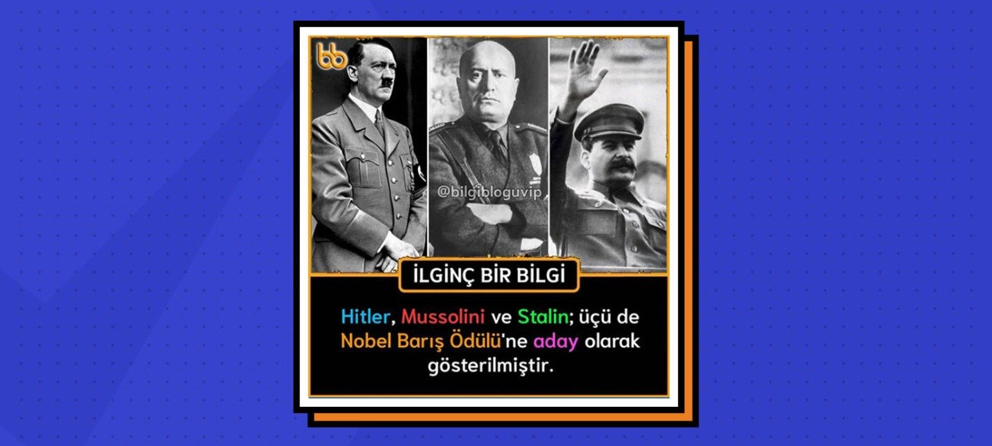 Bir Instagram sayfası tarafından 2 Ağustos 2020’de yapılan paylaşımda Adolf Hitler, Benito Mussolini ve Josef Stalin’in Nobel Barış Ödülü’ne aday gösterildiklerini iddia edildi. Paylaşım 1500’den fazla beğeni almış. Benzer içerikler farklı kaynaklarda da daha önce yer almış.