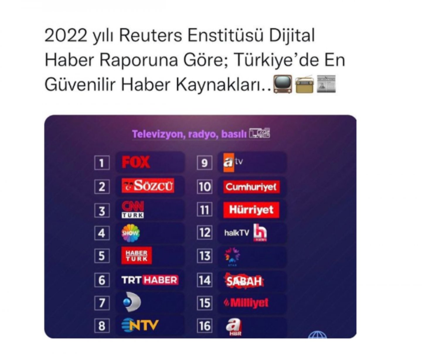 Bir Instagram hesabı tarafından paylaşılan listenin Reuters'ın paylaştığı ve bu listenin “Türkiye’deki En Güvenilir Haber Kaynaklarını” gösterdiği iddia edilmişti. Reuters Gazetecilik Araştırma Enstitüsü, her yıl dünyadaki dijital haber tüketimini anlamaya yönelik hazırladığı raporun 2022 yılı için verilerini paylaştı. Instagram’da paylaşılan liste “en güvenilir haber kaynakları” listesini göstermiyor. Reuters’ın raporuna göre bu liste “Türkiye’de haftalık en çok takip edilen/izlenen medya kuruluşları” listesini gösteriyor. Televizyon, radyo ve basılı gazeteler arasında haber kaynağı olarak ilk 5’te, FOX Haber, Sözcü, CNN Türk, Show TV ve Habertürk yer alıyor. Özetle, sosyal medya iddiasındaki listede de “en güvenilir haber kaynakları listesi” aksine “Türkiye'de en çok hangi kuruluşlardan haber alınıyor?” listesi yer alıyor. Rapora göre FOX Haber, Türkiye’nin hem en popüler hem de en güvenilir haber kaynağı.