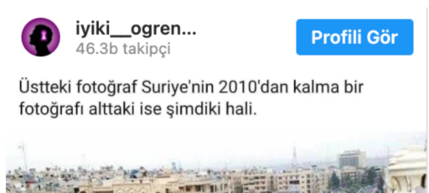 Bir Instagram sayfası tarafından 29 Mart 2021 tarihinde paylaşılan iki fotoğrafın, savaş öncesi ve savaş sonrası Suriye'de çekildiği iddia edildi. Gönderi Instagram’da 890 binden fazla görüntülenme alırken, bin 600’den fazla da beğeni topladı.