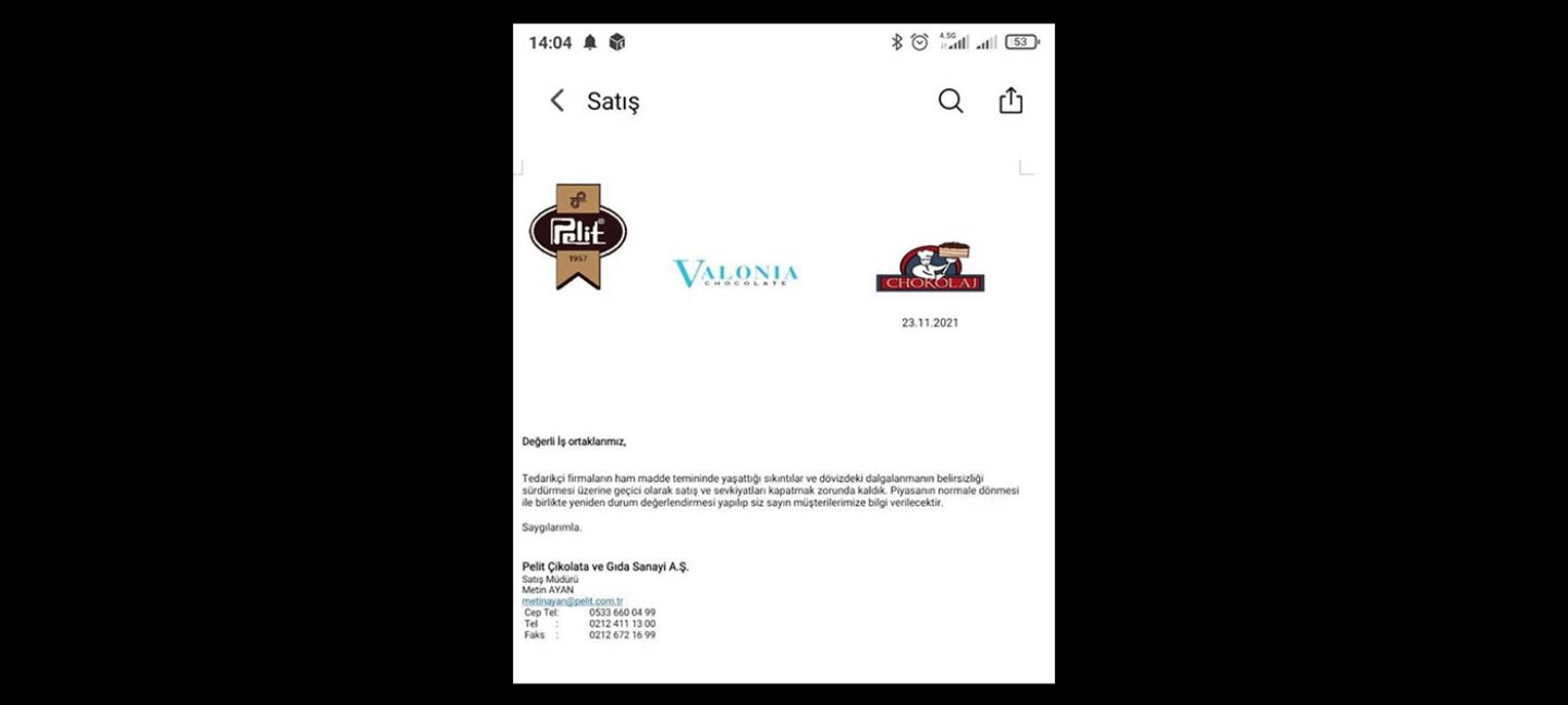 “23.11.2021 Değerli İş ortaklarımız, Tedarikçi firmaların ham madde temininde yaşattığı sıkıntılar ve dövizdeki dalgalanmanın belirsizliği sürdürmesi üzerine geçici olarak satış ve sevkiyatları kapatmak zorunda kaldık. Piyasanın normale dönmesi ile birlikte yeniden durum değerlendirmesi yapılıp siz sayın müşterilerimize bilgi verilecektir.